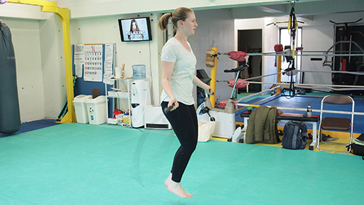 • 縄飛び(ロープスキッピング)でキックボクシングのリズムを体験します。心拍数を上げ、体を温める効果もあります。