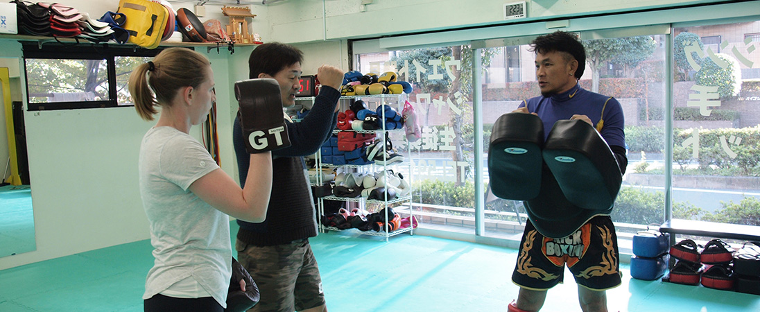 • 指導を受けながらシャドウボクシングでパンチ・キックなどキックボクシングの動きを体験します。